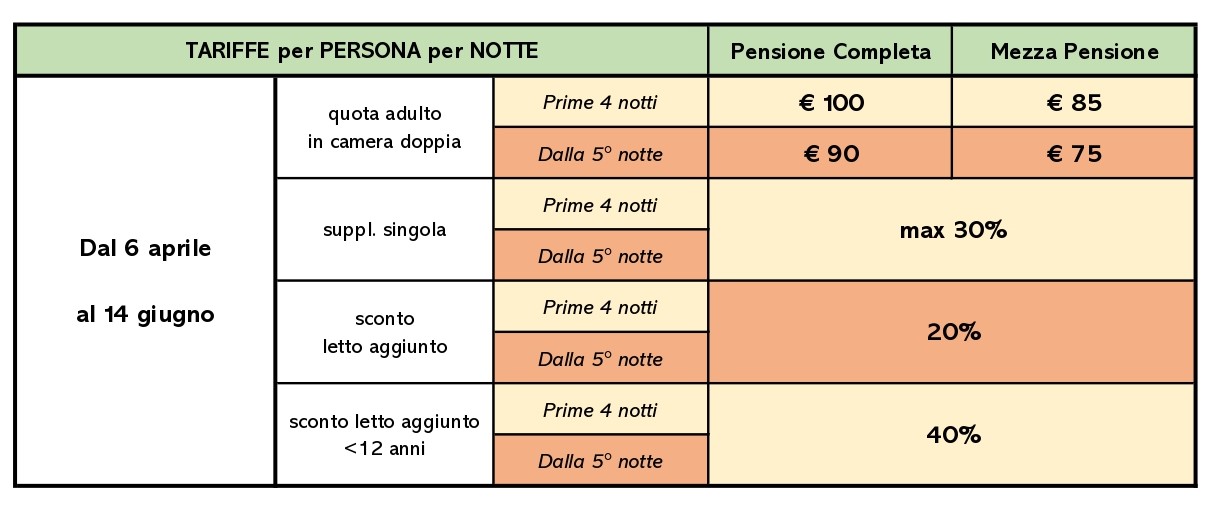(Tariffe Valide dal 6 aprile al 4 ottobre, esclusi i Ponti del 25 aprile, 1° Maggio e 2 Giugno)Prezzi SCONTATI dalla QUINTA NOTTE