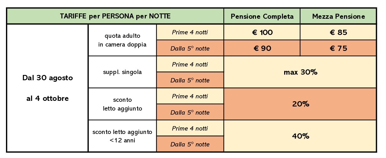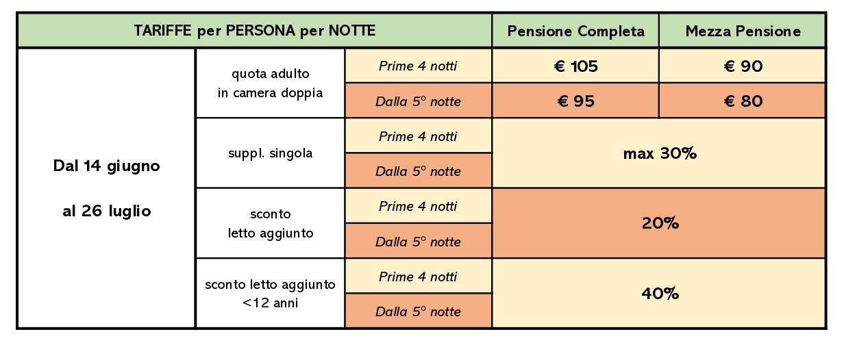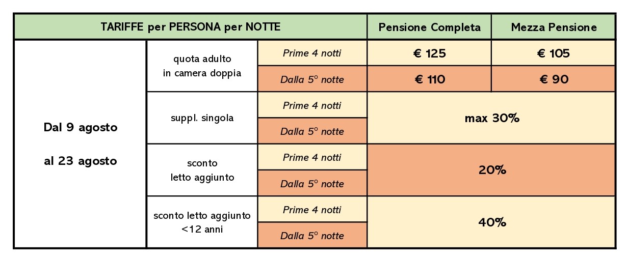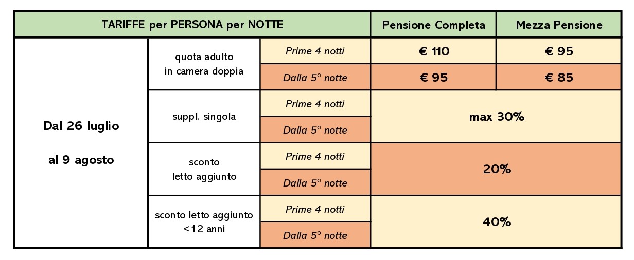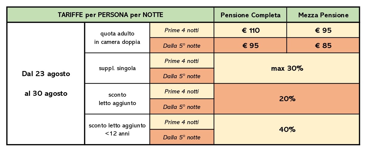 - Infant (nati dopo il 1/5/2022): gratis, disponibilità di una cucina attrezzata "mamme"